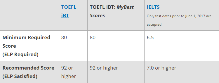 托福最低80分,接受拼分成績。低于92分錄取者要額外參加學校的語言課程。