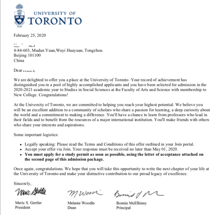 C同學在計劃出國留學的時候,目標國家并不是加拿大,而是熱門留學國家之一美國。由于他一開始申請時的SAT只有1300+多分,所以前期他的精力集中放在了標化考試上。所以當美國大學的早申告一段落后,他對未知的結果并不是滿懷信心,在等待12月份標化出分的同時,C同學為自己的努力是否會有理想成績和高校夢想是否會落空而倍感焦慮。相信這種情況在每年的美國申請大軍中,不是偶然的案例。知道C同學及他父親的目標一直是高校錄取,經過溝通之后,我當時給了他們一個建議:考慮轉戰加拿大。無論是從申請方式和申請時間來看,加拿大的大學,無疑是一個上上之選。經過學校目標的挑選,我們決定以最快的速度申請多倫多大學。這所大學是學生最想去的學校。雖然今年多倫多大學官網建議的國際生早申截止日很早且已過。但是根據多年經驗,我認為憑借C同學的GPA、活動以及比較高的托福成績,還是有希望的。如果他后面能考出更理想的SAT 成績,勝算就更大了。經過一番緊張的準備,我們在做出決定的第二天就遞交了多倫多大學申請。完成初步申請遞交后,我們每天在多倫多大學的跟蹤系統里查詢狀態并補交材料,并在補充文書中最大化的放大學生優點,保證申請材料的完整。令人高興的是C同學后面也考出了比較高的SAT成績,加上他在整個過程中對申請非常重視并高度配合,也使得一切都得到了順利進行。當我們拿到多倫多大學的錄取時,我們的轉申選擇、我們的努力及我們的配合都得到了最好的證明!